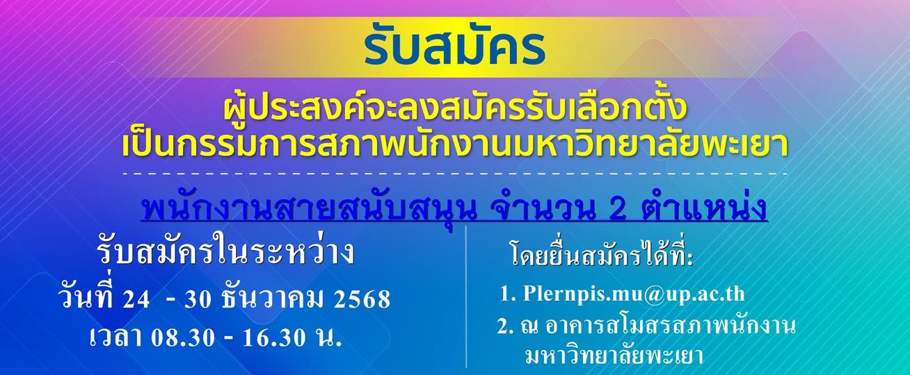 รับสมัคร ผู้ประสงค์จะลงสมัครรับเลือกตั้งเป็นกรรมการสภาพนักงานมหาวิทยาลัยพะเยา สายสนับสนุน จำนวน 2 ตำแหน่ง