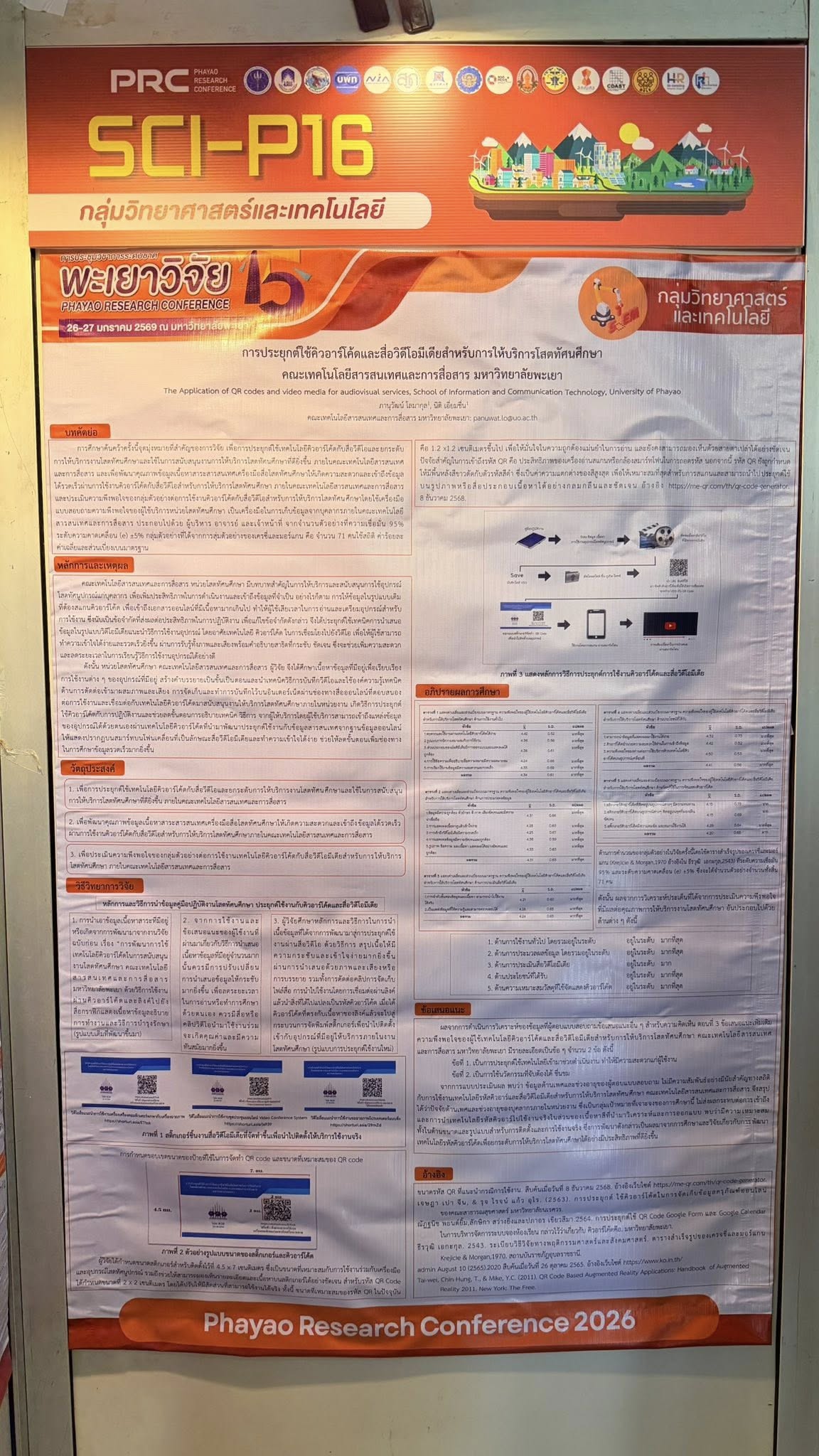 ในหัวข้อที่นำเสนอ คือ "การประยุกต์ใช้เทคโนโลยีคิวอาร์โค้ดและสื่อวิดีโอมีเดียสำหรับงานโสตทัศนศึกษาคณะเทคโนโลยีสารสนเทศและการสื่อสาร"